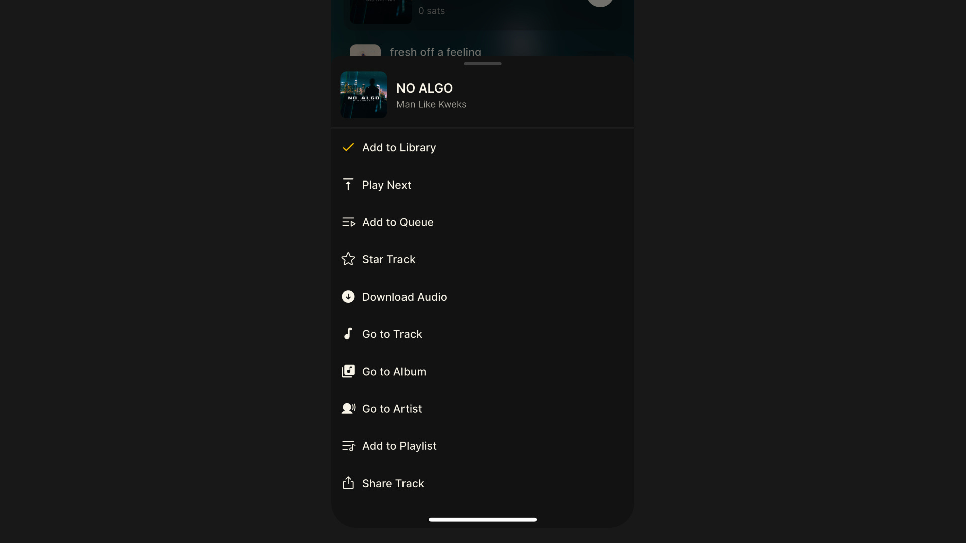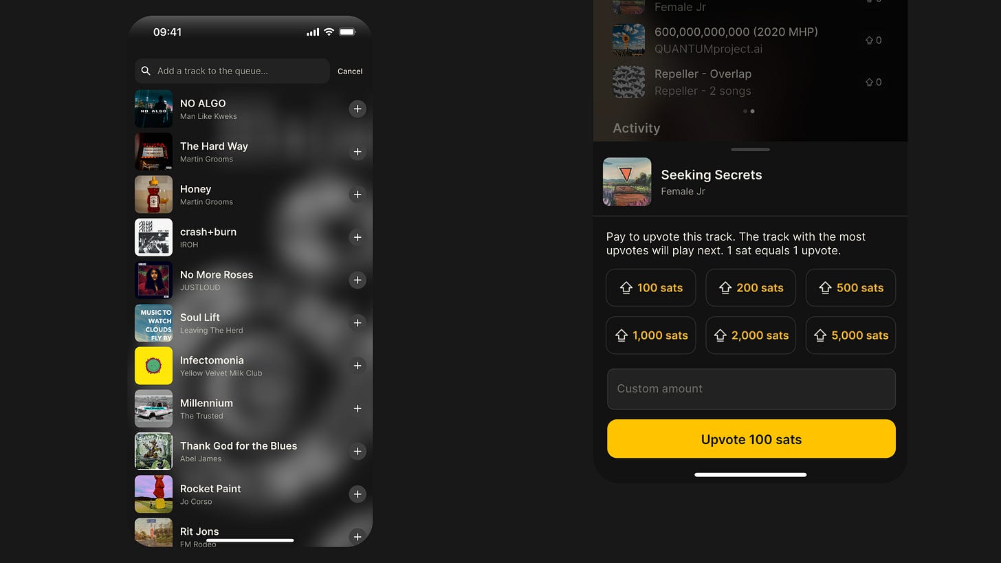 Search for tracks in your library or search all music on Fountain. Adding a track to the costs 100 sats (less than $0.10) and your selection will be added to the end of the queue. You can pay to upvote any track in the queue to change its position. 1 sat equals 1 upvote and the track with the most upvotes will play next. Just like zaps, you can pay as much as you like but the minimum is 100 sats.