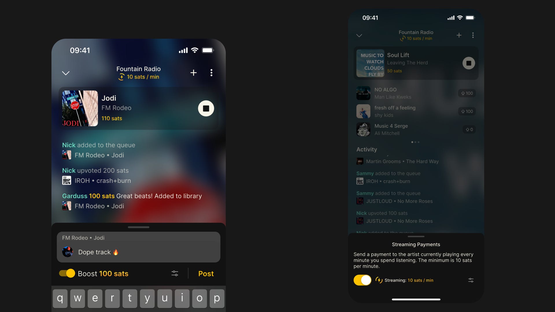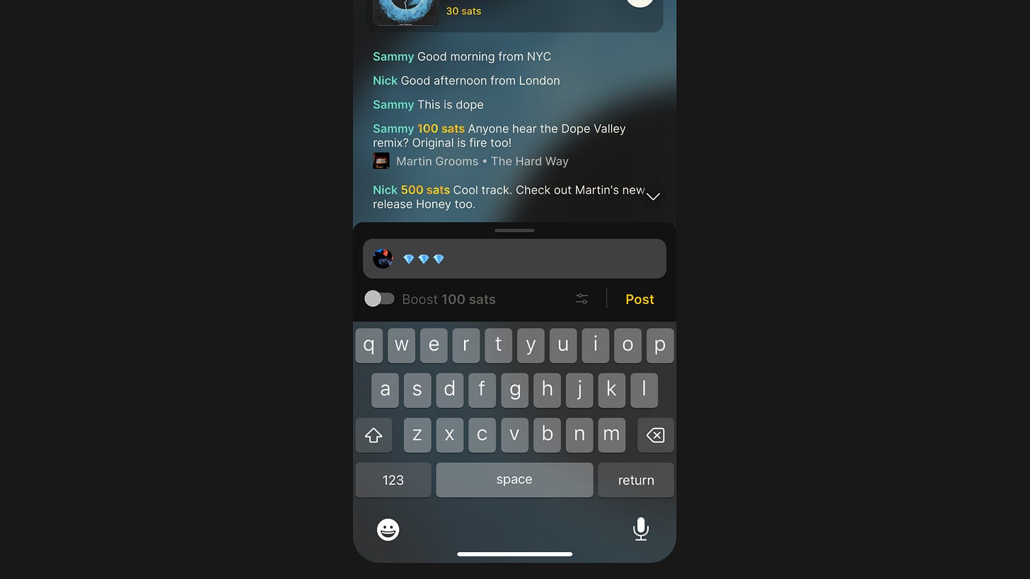Boost to send a payment with a message on enable streaming to send a small amount for every minute you spend listening. 95% of every boost and streaming payment goes directly to the artist currently playing and the remaining 5% is set aside for fees paid to PodcastIndex and Fountain.