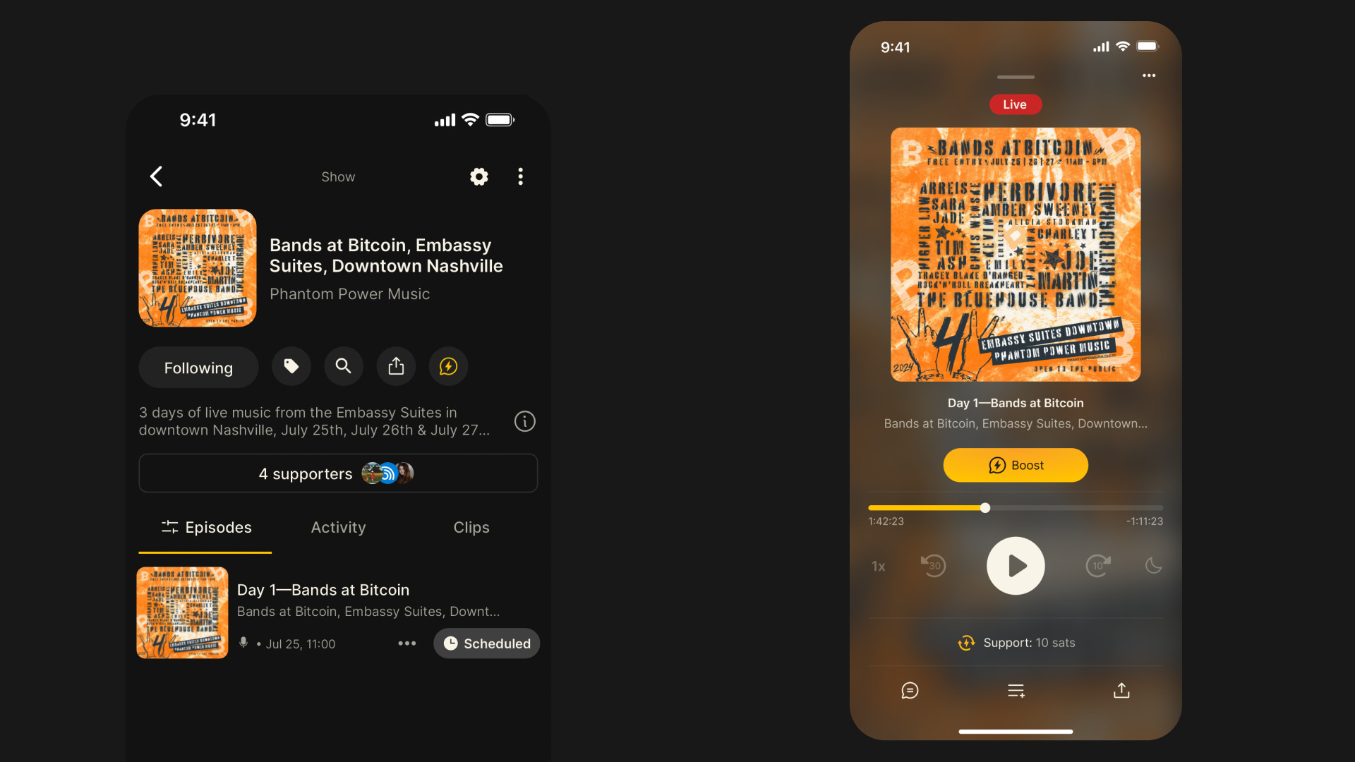 Click here then choose “open in Fountain”, or just open the app and search Bands at Bitcoin 2024. Hit the follow button and the livestream will be pinned to the top of your library every day. If you have push notifications from Fountain enabled, you will receive a notification when each livestream starts.