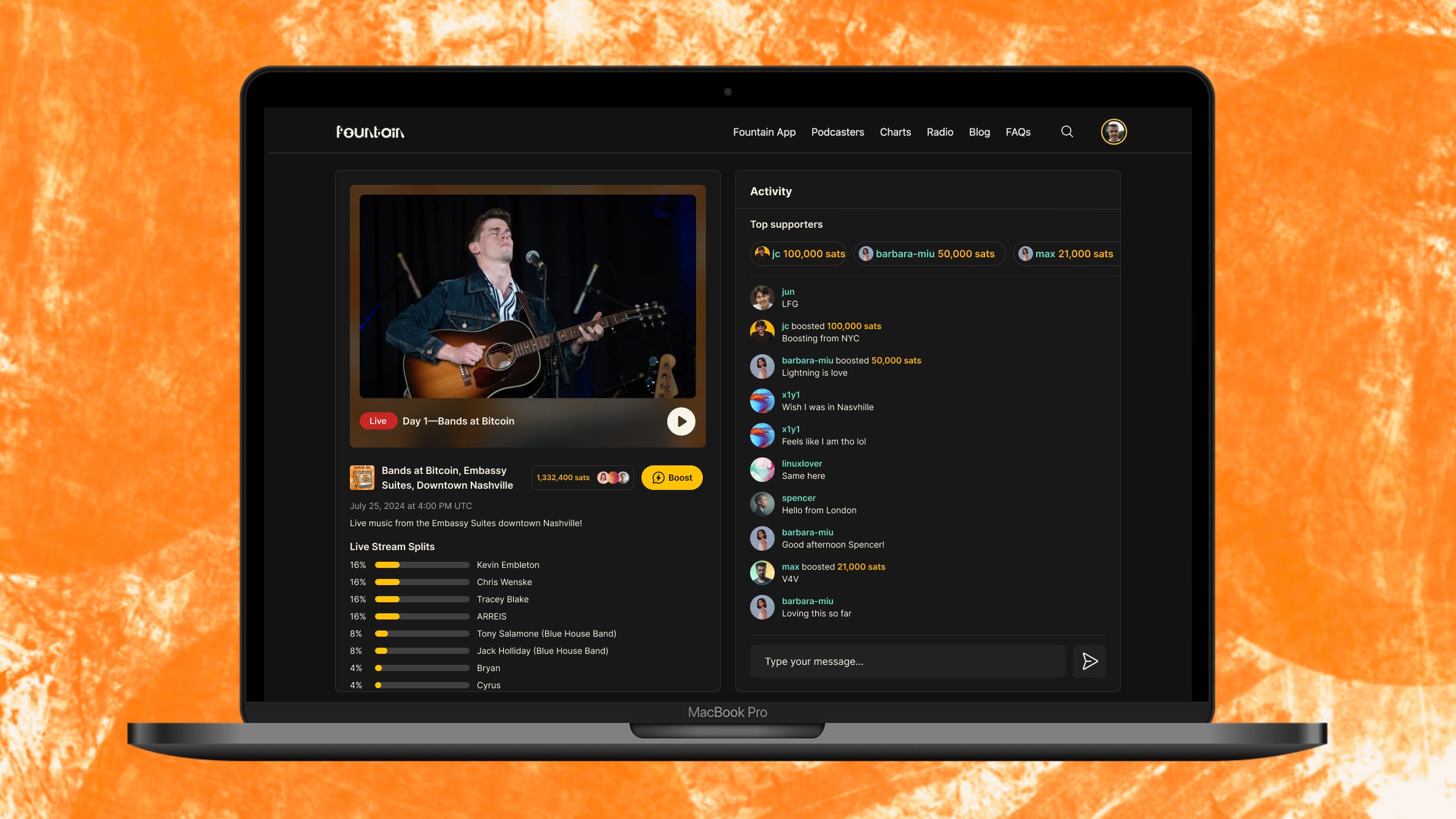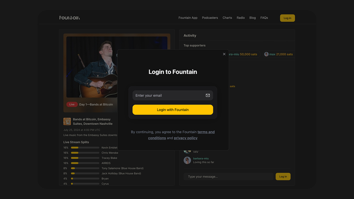 If you didn’t make it to Nashville this week, you can join the Bands at Bitcoin 2024 livestream in the Fountain app and on web. Day one kicks off today at 11:00 CST (late on Thursday afternoon if you’re in Europe). You can find full details on how to join the livestream below.