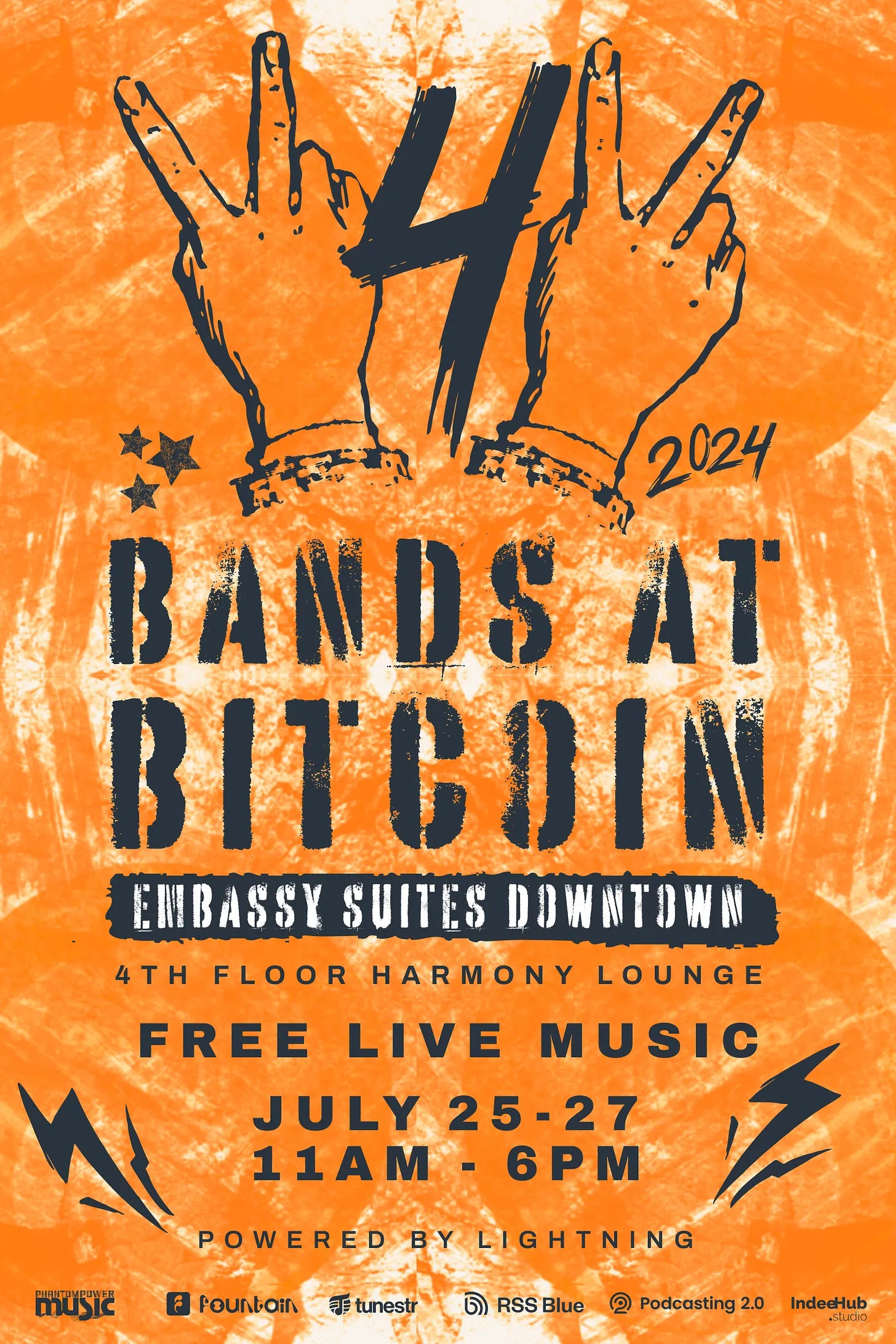 Bands at Bitcoin 2024 is where we will be spending most of our time. Three days of free live music from amazing artists taking place on the fourth floor at Embassy Suites Downtown, just across the street from the conference venue.