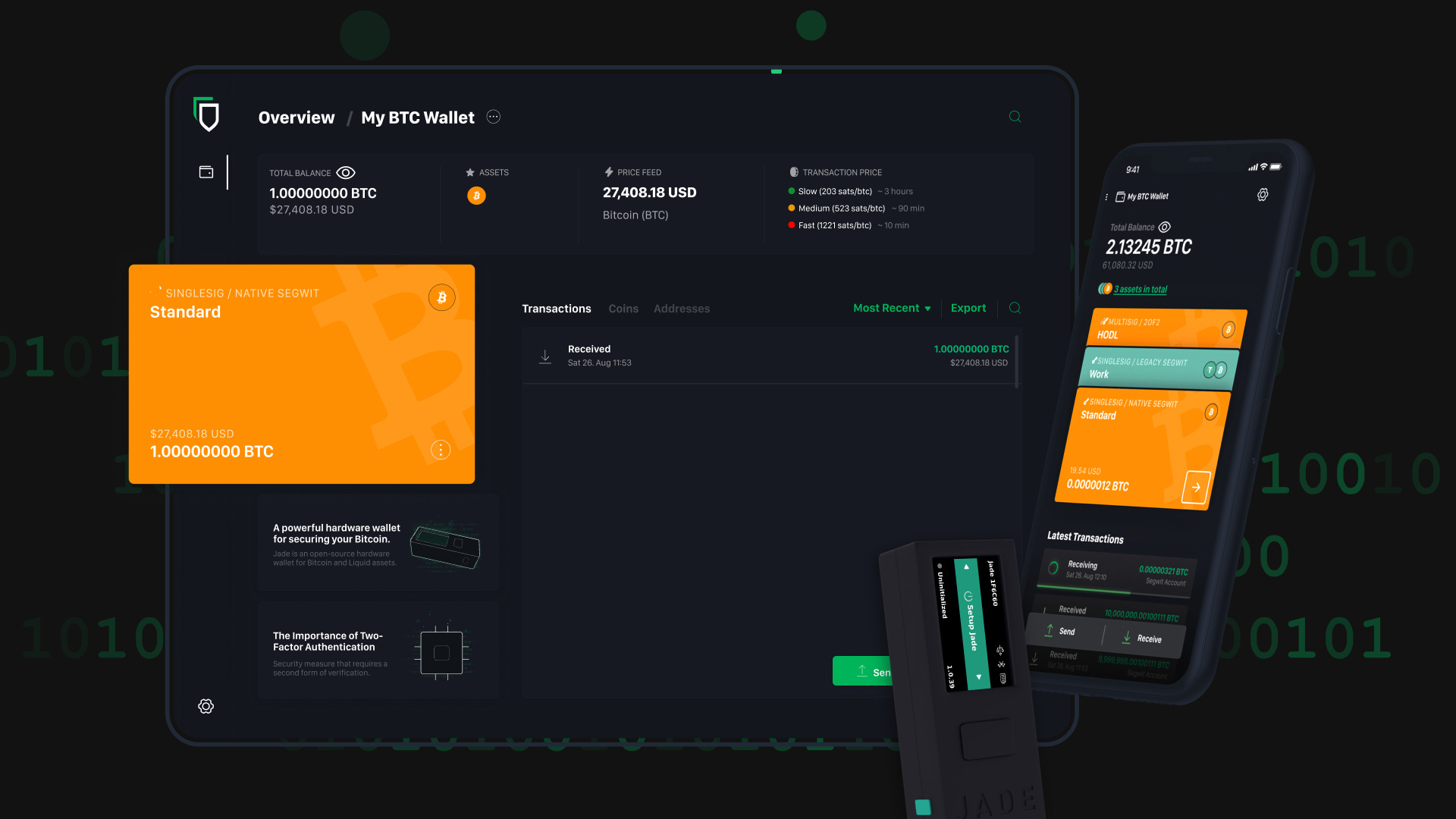 Jade offers a dedicated companion app on mobile and desktop for a seamless, step-by-step onboarding experience, but it’s also compatible with other popular wallets too such as Sparrow, Nunchuk and BlueWallet.