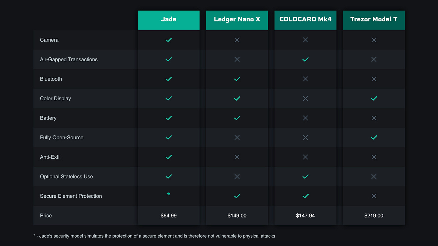 Virtual secure element: Jade's unique security model allows your device to remain fully open-source while preventing physical key extraction.