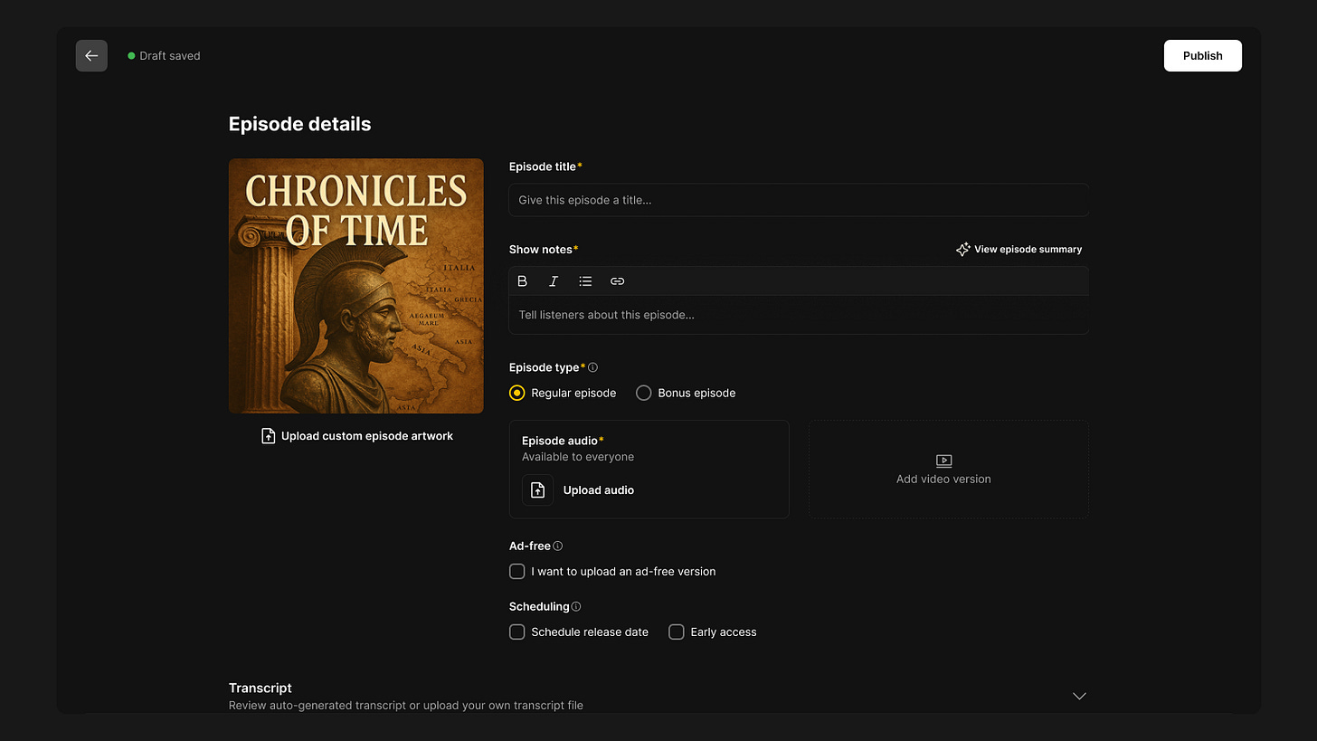 Upload video versions. Your video is embedded directly in your RSS feed, allowing listeners to toggle between audio and video on supporting apps.