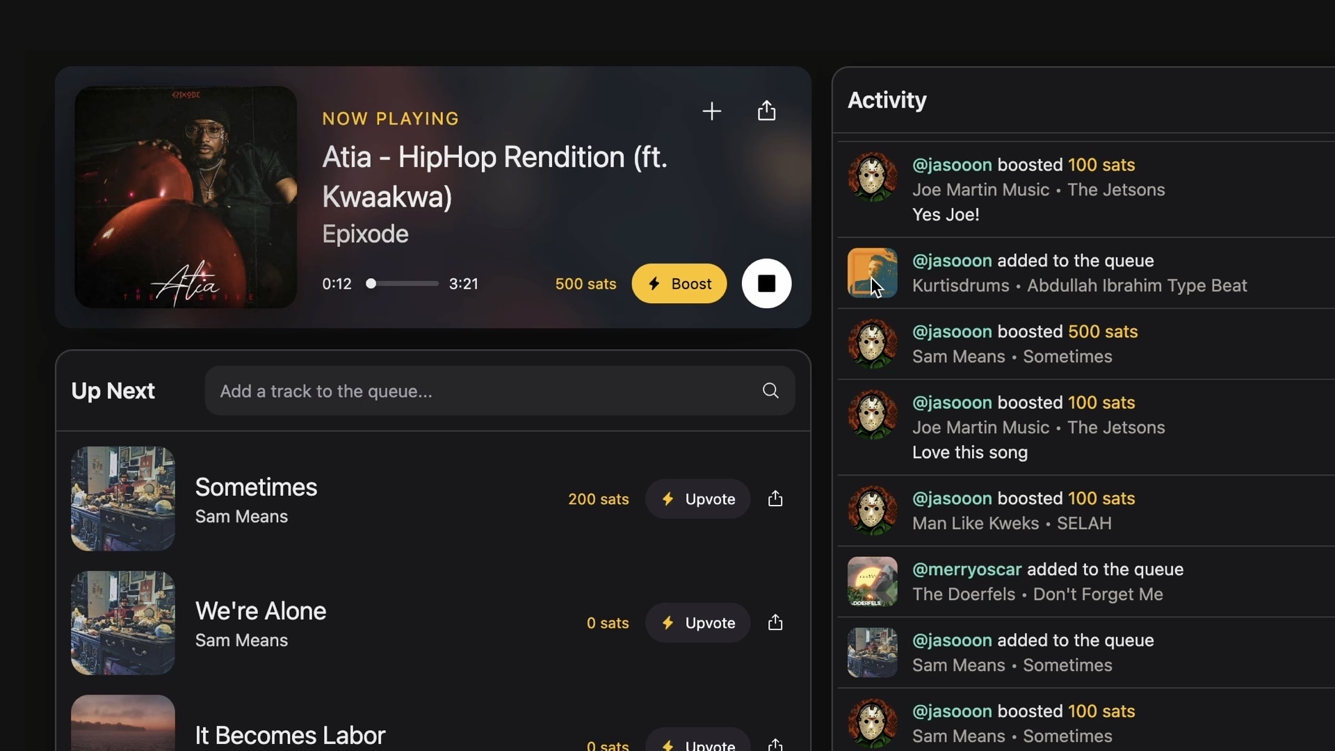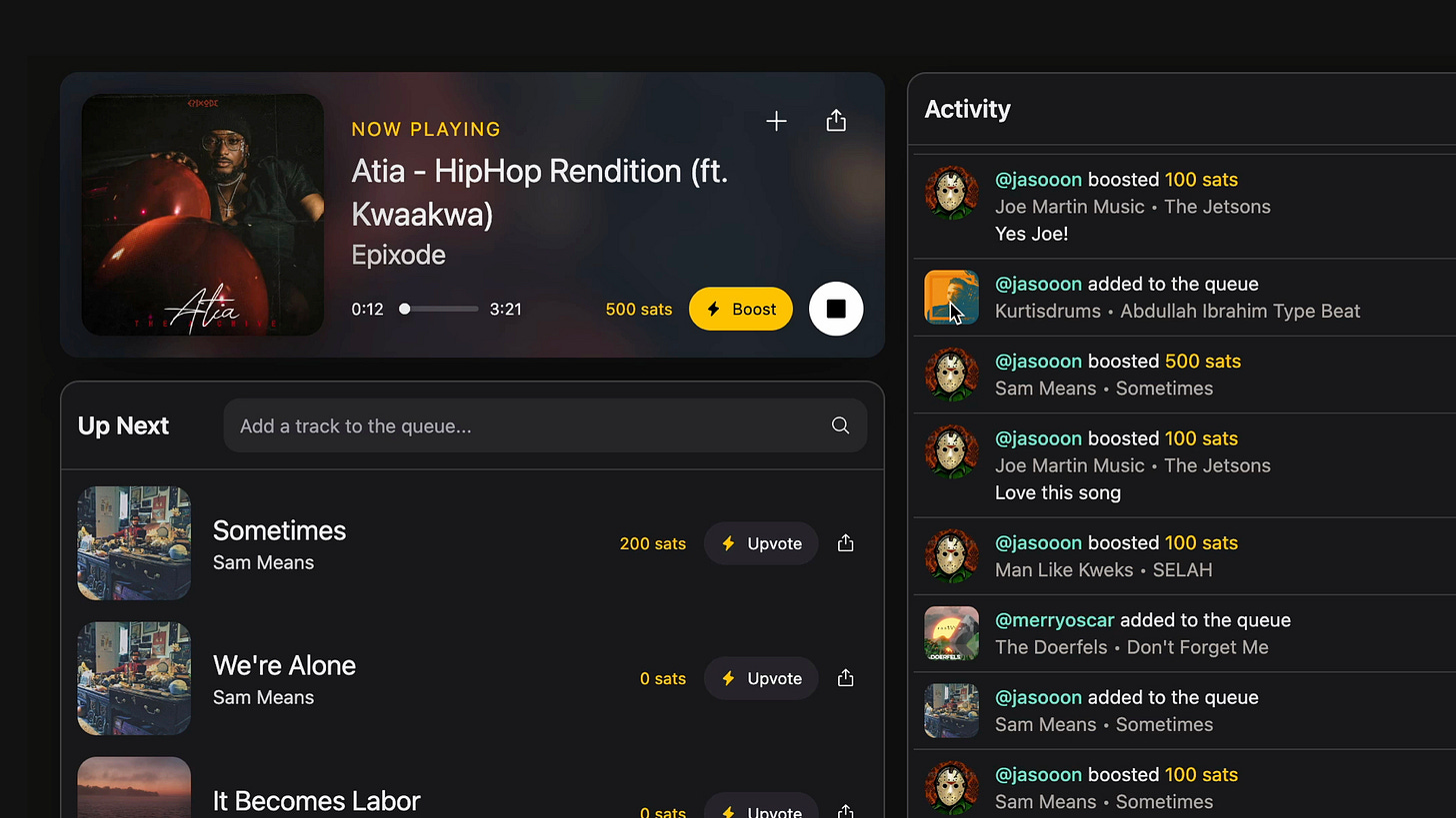 Upvote tracks to move them to the front of the queue. The track with the most sats will play next.
