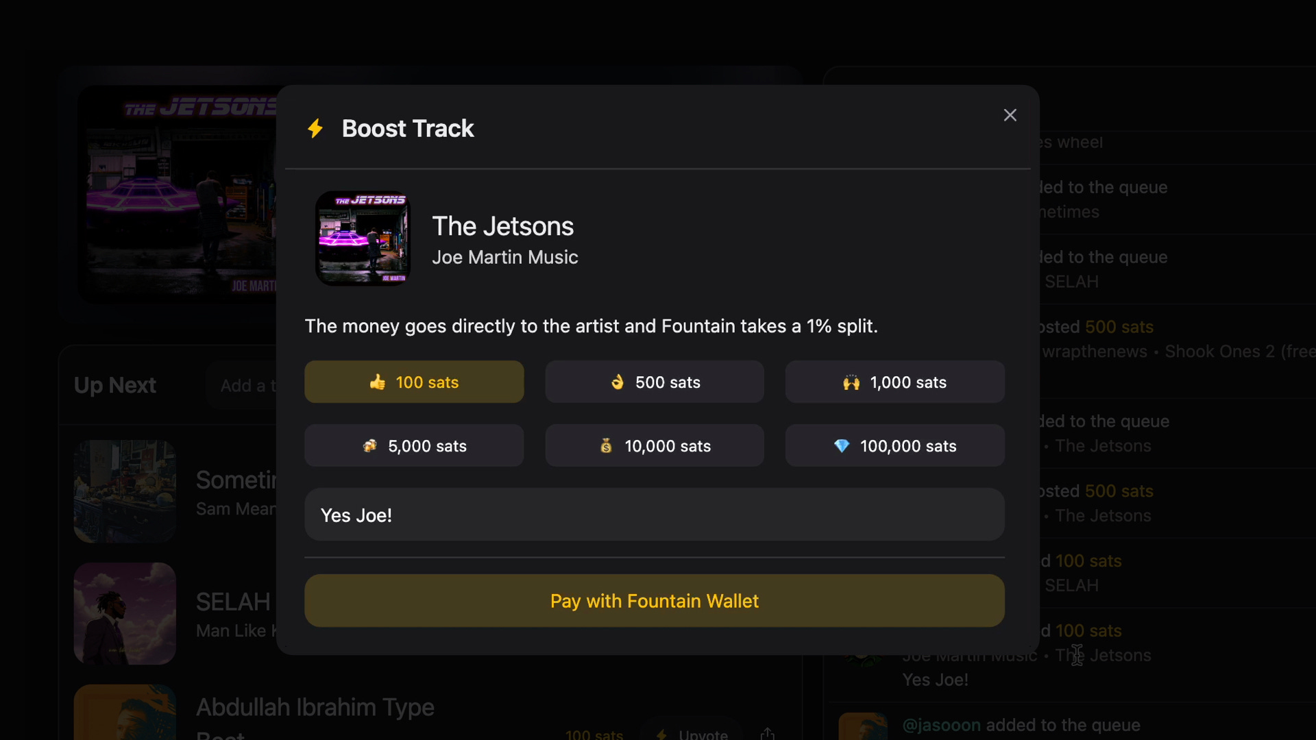 Listen to the track currently playing and boost to support. Fountain takes a 1% split and the rest goes to the artist.
