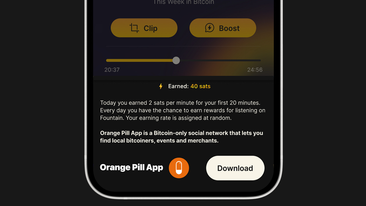 Orange Pill App is sponsoring rewards on Fountain this week. Next time you check your earning rate in the app, make sure you head over to orangepillapp.com to sign up or download the app from the App Store or Google Play Store to build your local network of Bitcoiners and to find a Bitcoin meetup or merchants accepting Bitcoin!